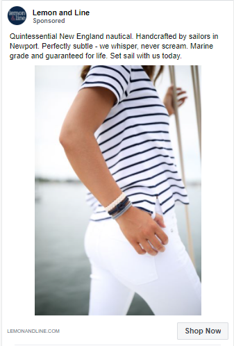 Check out how Lemon and Line uses a serene and harmonious vibe to subtly draw attention to its bracelets. The ad is accompanied by a great color pallet, smart copy, and a clear call to action.
