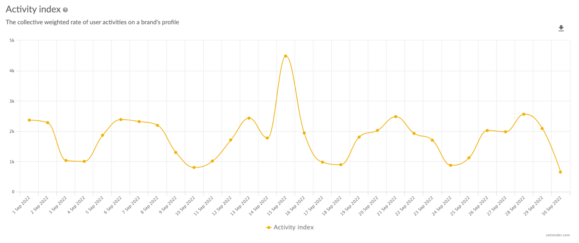 Activity Index is Sotrender’s unique metric. It is the collective weighted rate of user activities on a brand’s profile, informing you how active your followers are on particular days as well as during certain times. What is important, the Activity Index measures not only user engagement but also the character of it – each Twitter activity is weighted accordingly.