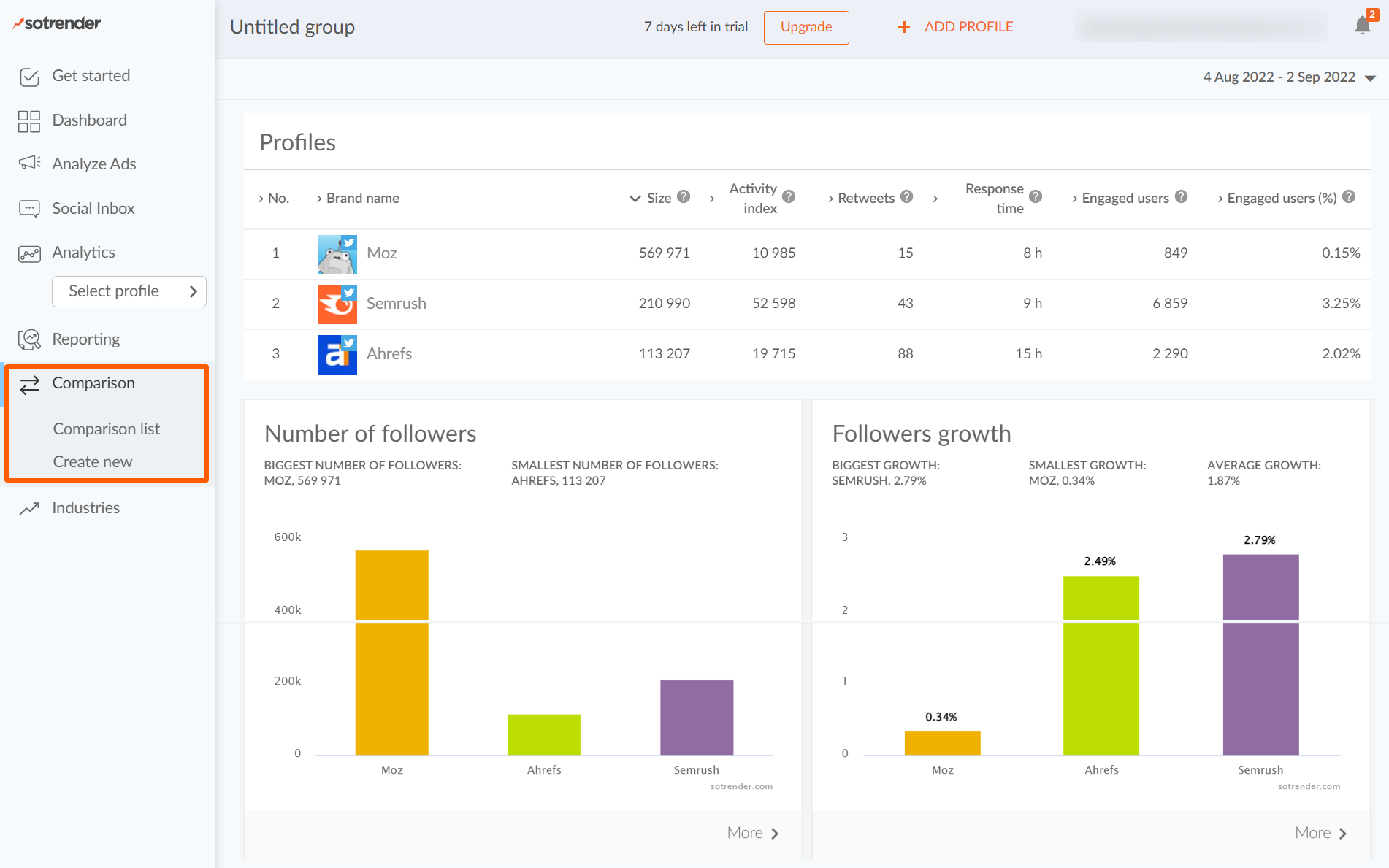 Last but not least, Sotrender has a comparison report that allows you to see how you stack up against other brands on Twitter. Click on Comparison and add the profiles you want to view side by side.