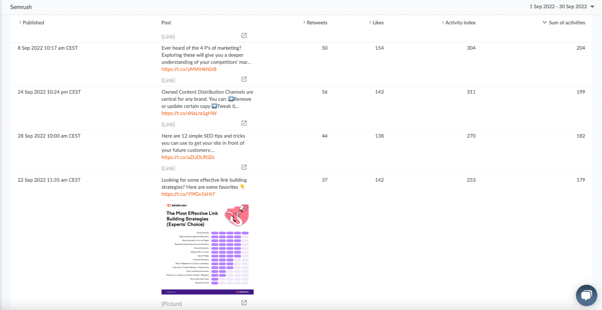 Identifying your top tweets on Twitter can be extremely helpful in creating a successful content strategy. In Sotrender, you can quickly view all posts published in a selected time period with their stats (like retweets, likes, Activity Index). This way, it is easy to understand what kinds of content that you publish perform well, and which ones do not bring expected results.
