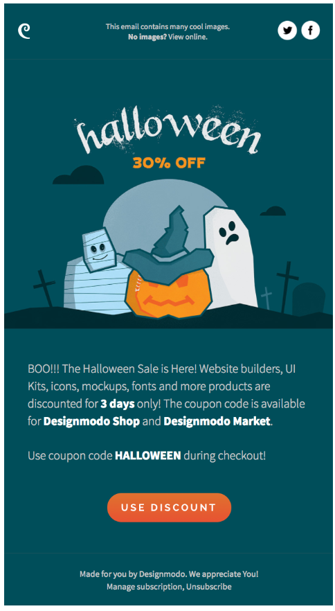 Designmodo’s Halloween email ticks all the boxes, prompting recipients to open it and take action: special emojis in the subject line, ghoulish design, and a generous Halloween discount.