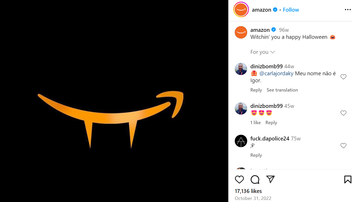 Amazon got creative by adding fangs to its logo and sharing it with its followers through a dedicated post: