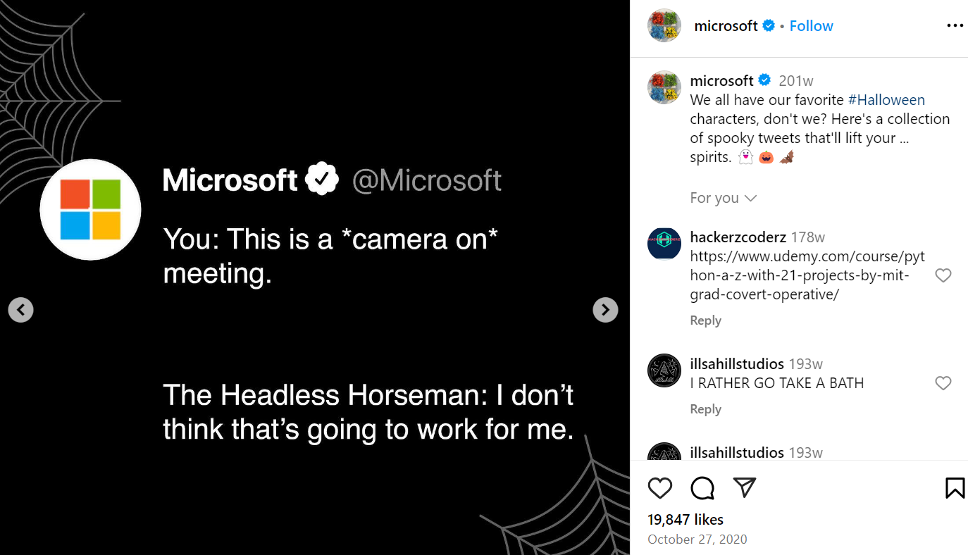 While Halloween Instagram marketing is the bread and butter of B2C companies, it’s a profitable occasion for B2B businesses, too. Tech giants like Microsoft and Amazon tap into the excitement of the season every year.