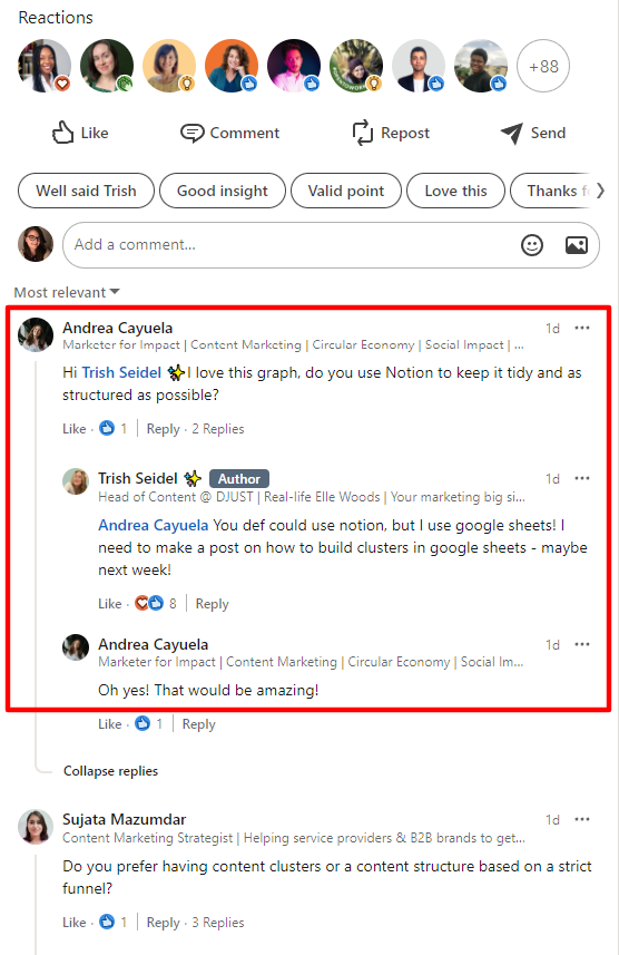 Trish Seidel, Head of Content at DJUST, posted a super helpful content cluster graph. This drummed up engagement. It also gave Trish more opportunities to show her expertise in the comments. Trish also responded to each question.