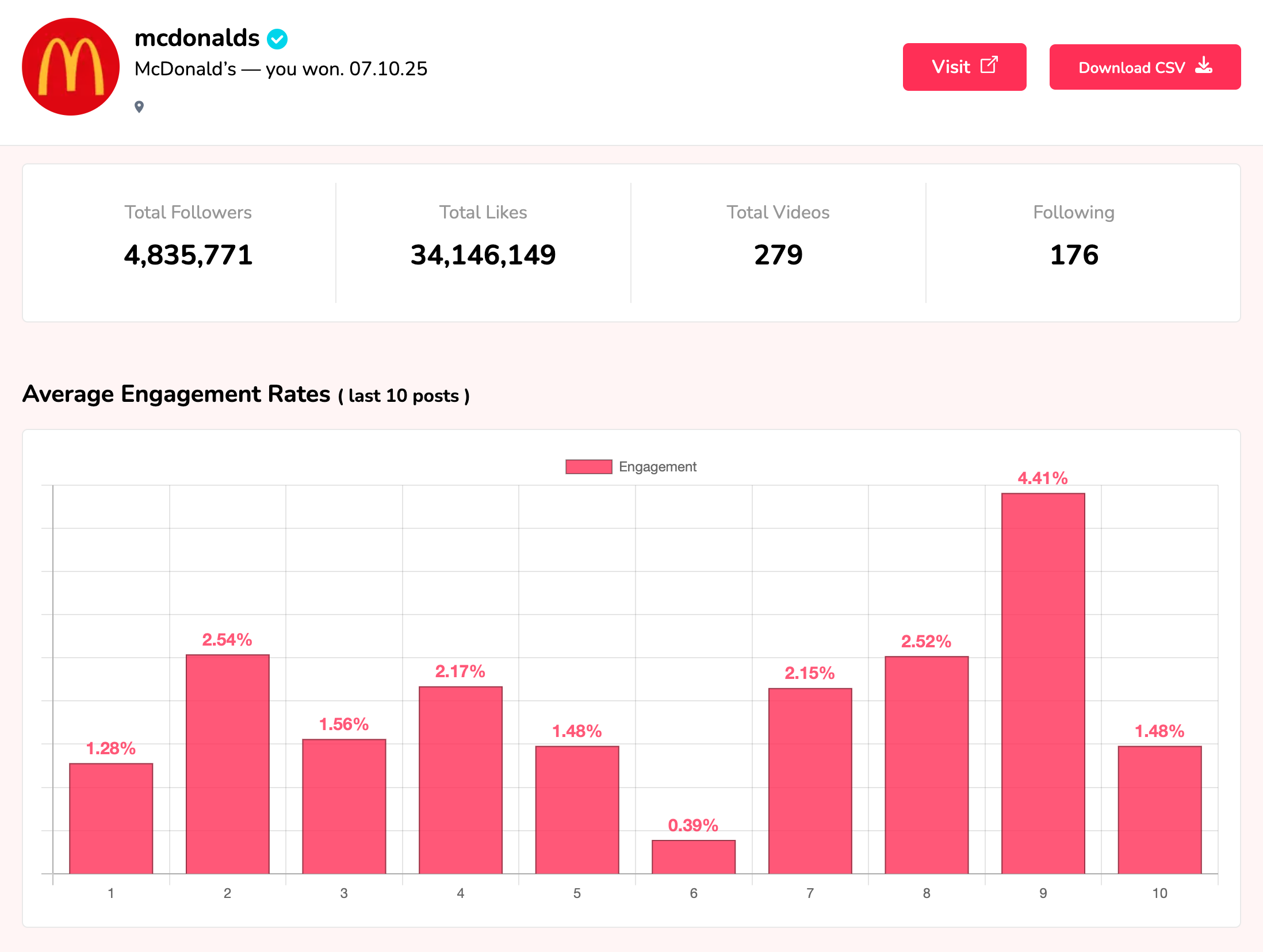 • Average views, likes, comments, and shares per post