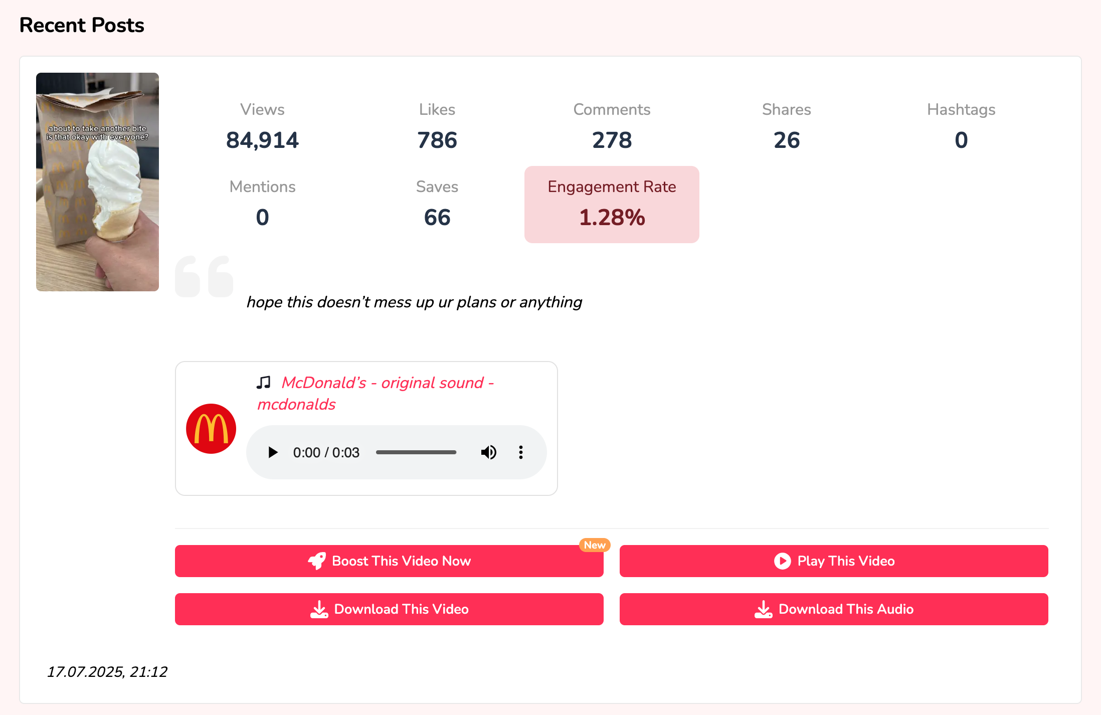 You’ll also get a breakdown of the most recent posts (up to around a dozen), along with basic performance metrics like likes, comments, views, saves, and engagement rate. There’s no sorting or filtering, but you can download the data in CSV format. This makes it easy to quickly identify your top videos based on engagement and view metrics.