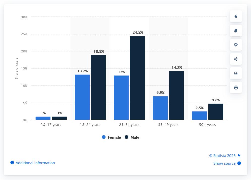 Note: Similar to Threads and LinkedIn, younger audiences are likewise the largest age population on X. However, when it comes to gender peculiarities, X has a noticeably higher share of male users.
