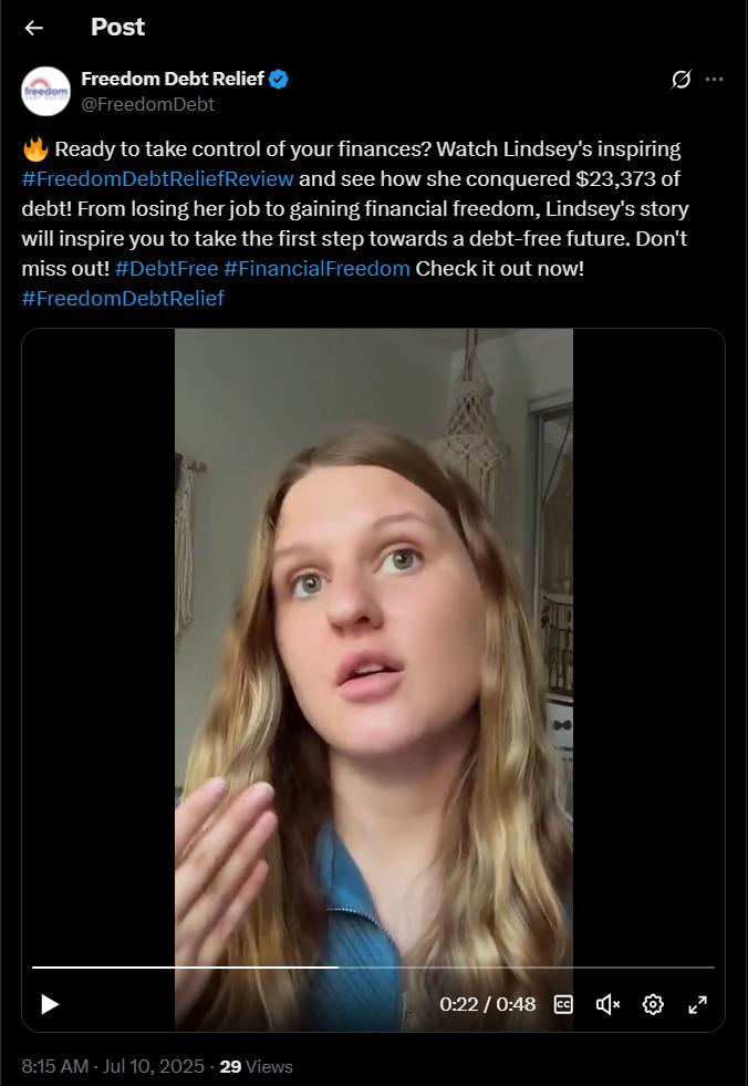Suppose your brand offers financial services. You may dole out money-related tips or share client testimonials, just like this debt relief review on X.