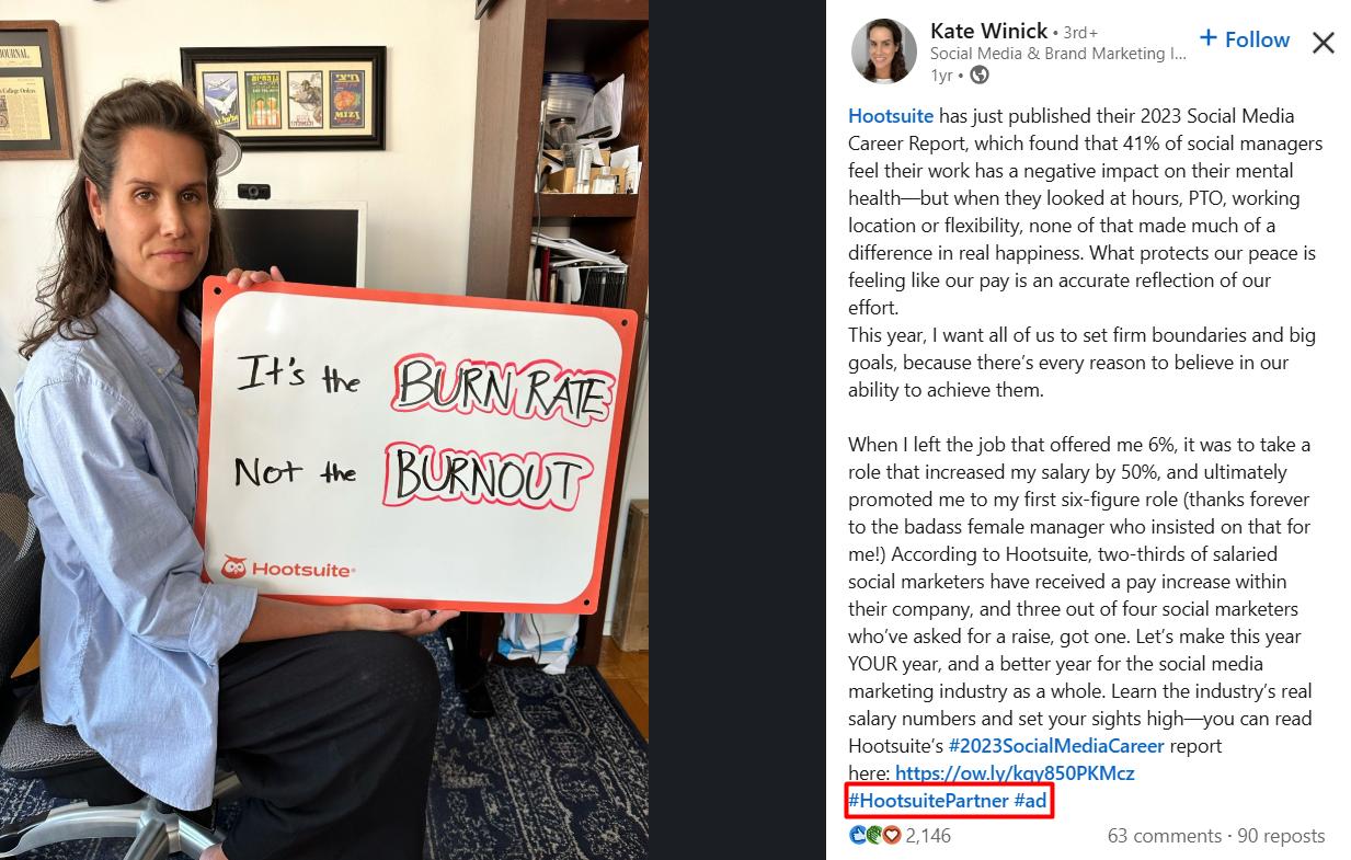 When you collaborate with influencers on any of those social channels, strictly outline the terms and conditions. Use contract management software to make sure they do things by the book, from the post count to disclosure, with the hashtags as follows: