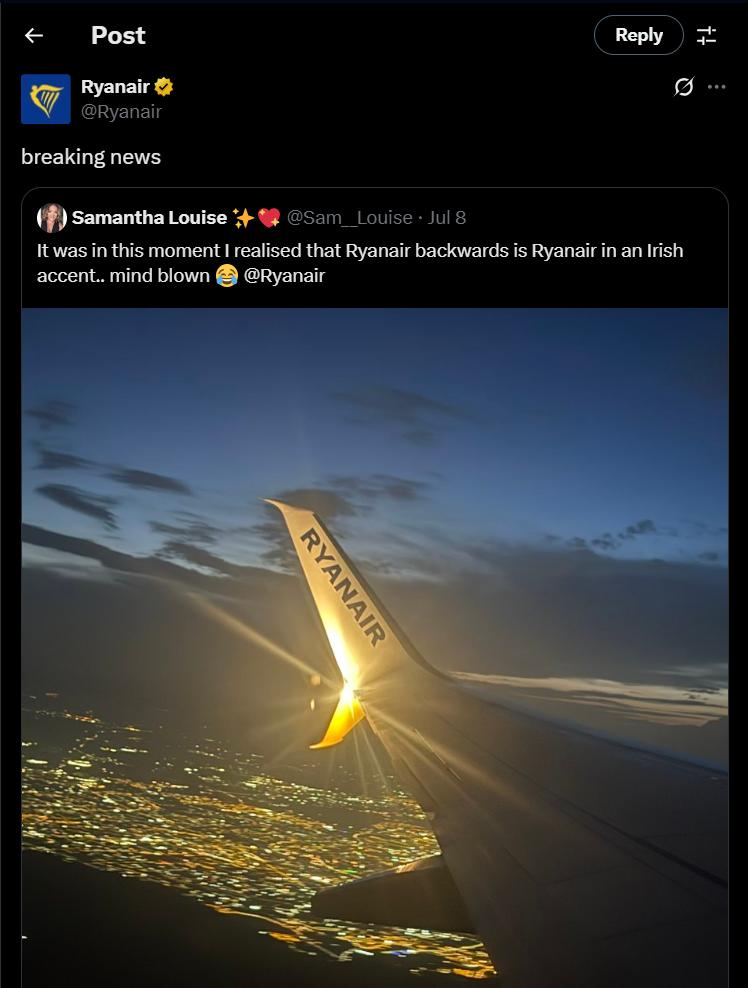 See how Ryanair mocked the customer with the slight “Breaking news” punch.