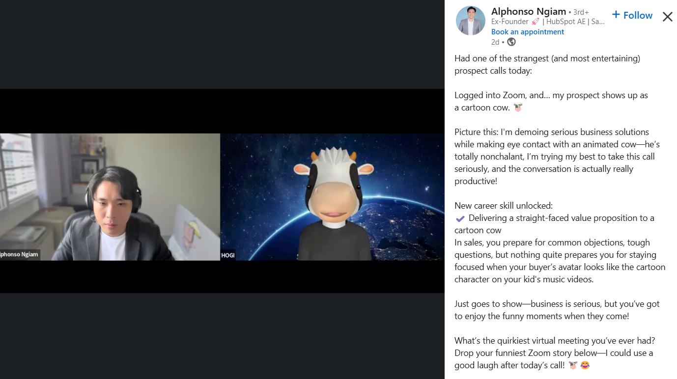 HubSpot’s CRM specialist shares how he unlocked a “new career skill” amid the funniest-ever Zoom call with a prospect as a cartoon cow.