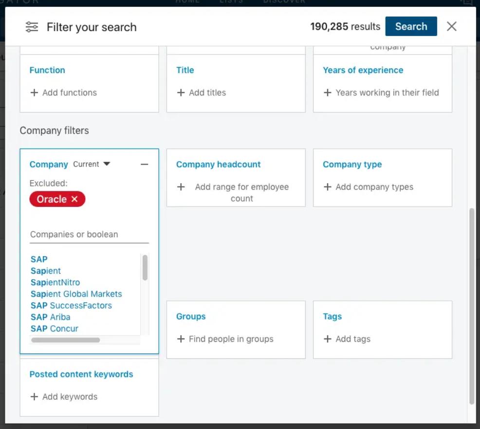 You may start with corporate profile browsing (manually and for free) for competitive research on LinkedIn. But you should also consider using LinkedIn Sales Navigator (paid but absolutely worth your time and money!), one of the best LinkedIn marketing tools with advanced search filters.