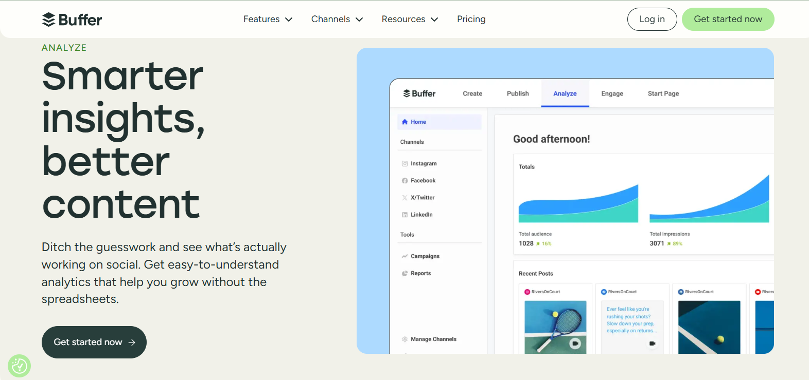Buffer focuses on giving you the basic Facebook performance data like reach, clicks, impressions, and engagement activity in one place, and you can break those results down by individual posts to understand what actually worked. The tool also shows how your content performs over time and provides simple recommendations for when to publish, based on your past audience activity.