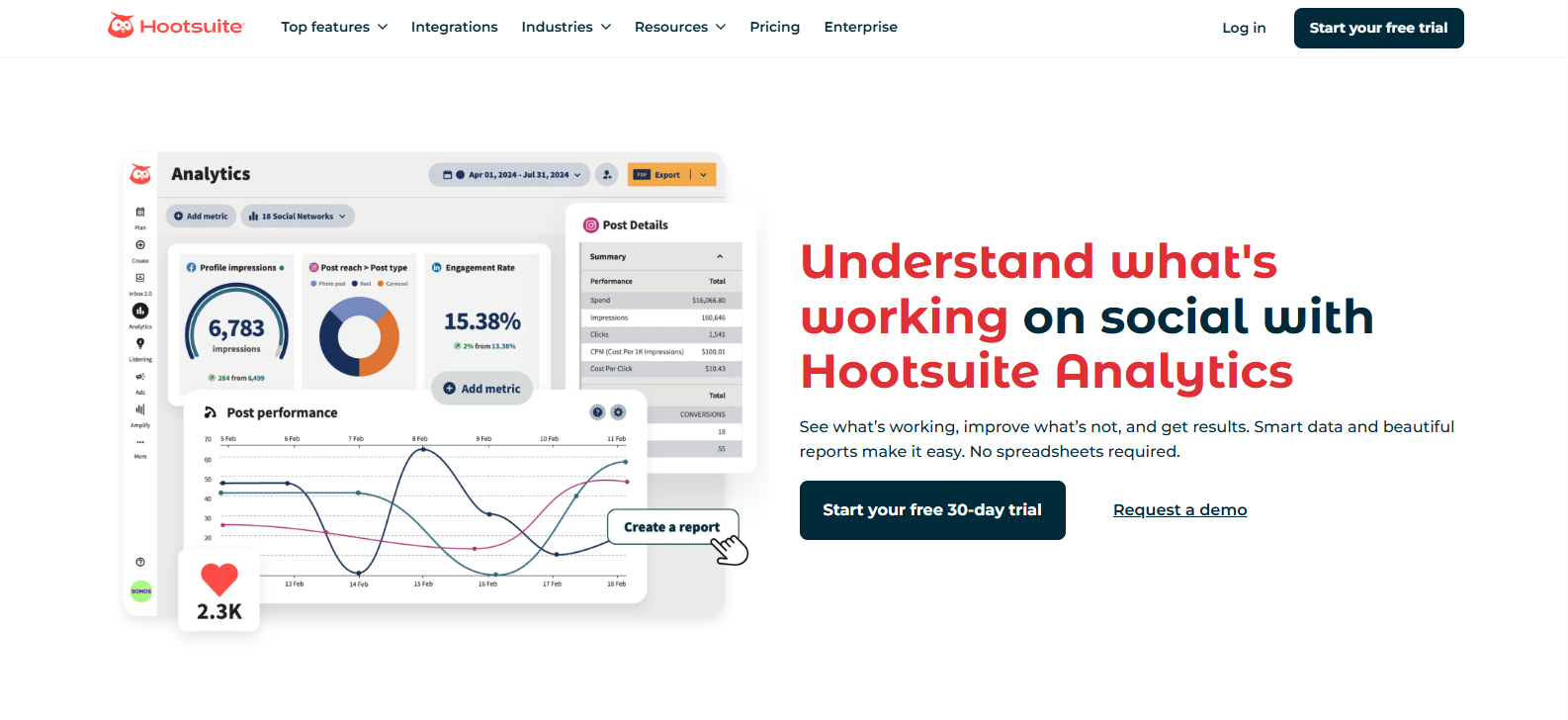 Hootsuite is more of a comprehensive social media management tool but it has an Analytic section which helps you drill into hundreds of Facebook metrics, build reports from pre-designed templates, and compare organic, paid, and earned activity side by side. It also includes competitive benchmarking reports, best-time-to-post insights, AI recommendations to improve your campaigns, and a performance score that shows how well your content strategy is performing throughout the week.