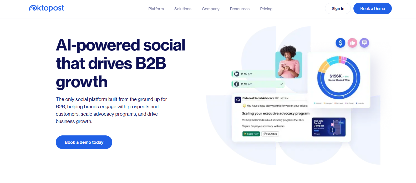 Oktopost is a strong choice for B2B Facebook marketers who want analytics connected to real business outcomes rather than basic engagement tracking. The only limitation is that pricing is fully custom and primarily for B2B teams.