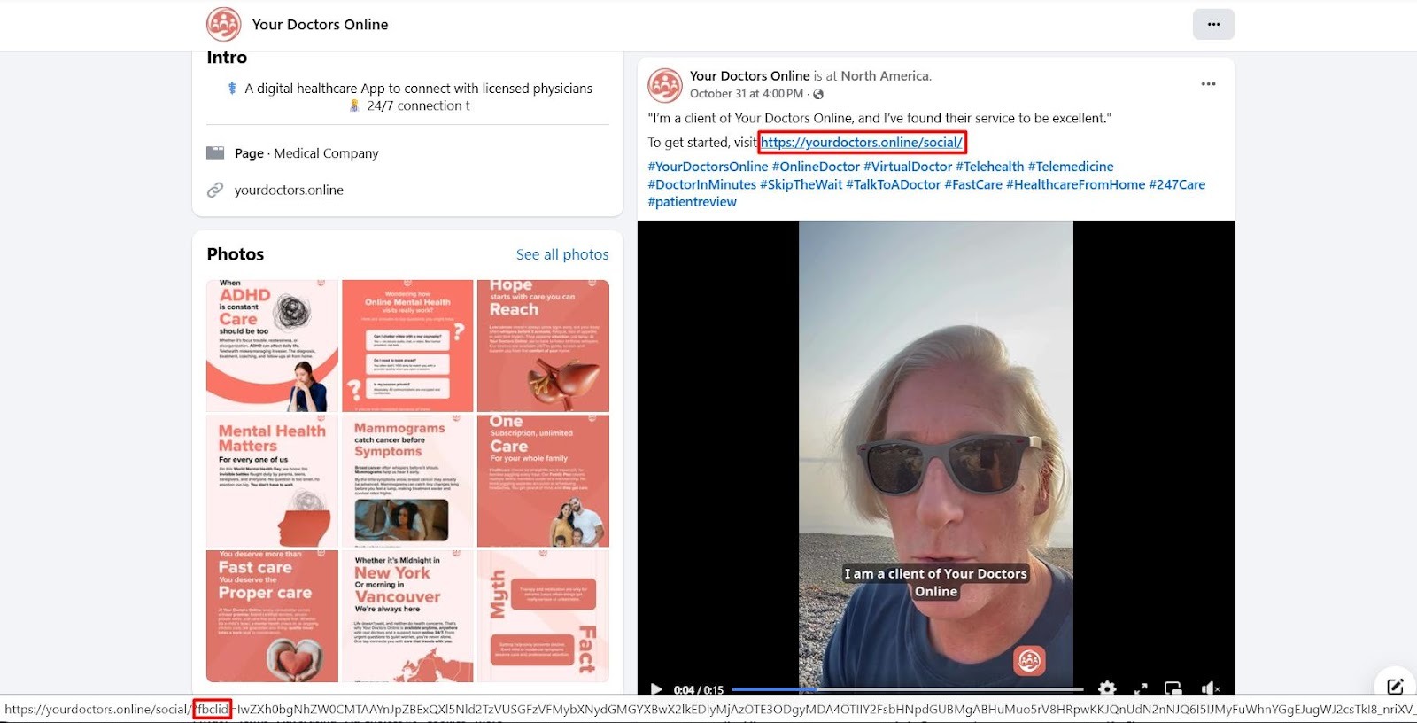 For example, Online Doctor, which is a telehealth care platform for online health consultations, uses the built-in meta-analysis feature called FBclid, aka Facebook Click ID. This ID allows Meta Business Suite to track link clicks on their image posts, videos, or UGC reels, as shown in the patient testimonial below, and report them in the analysis section.