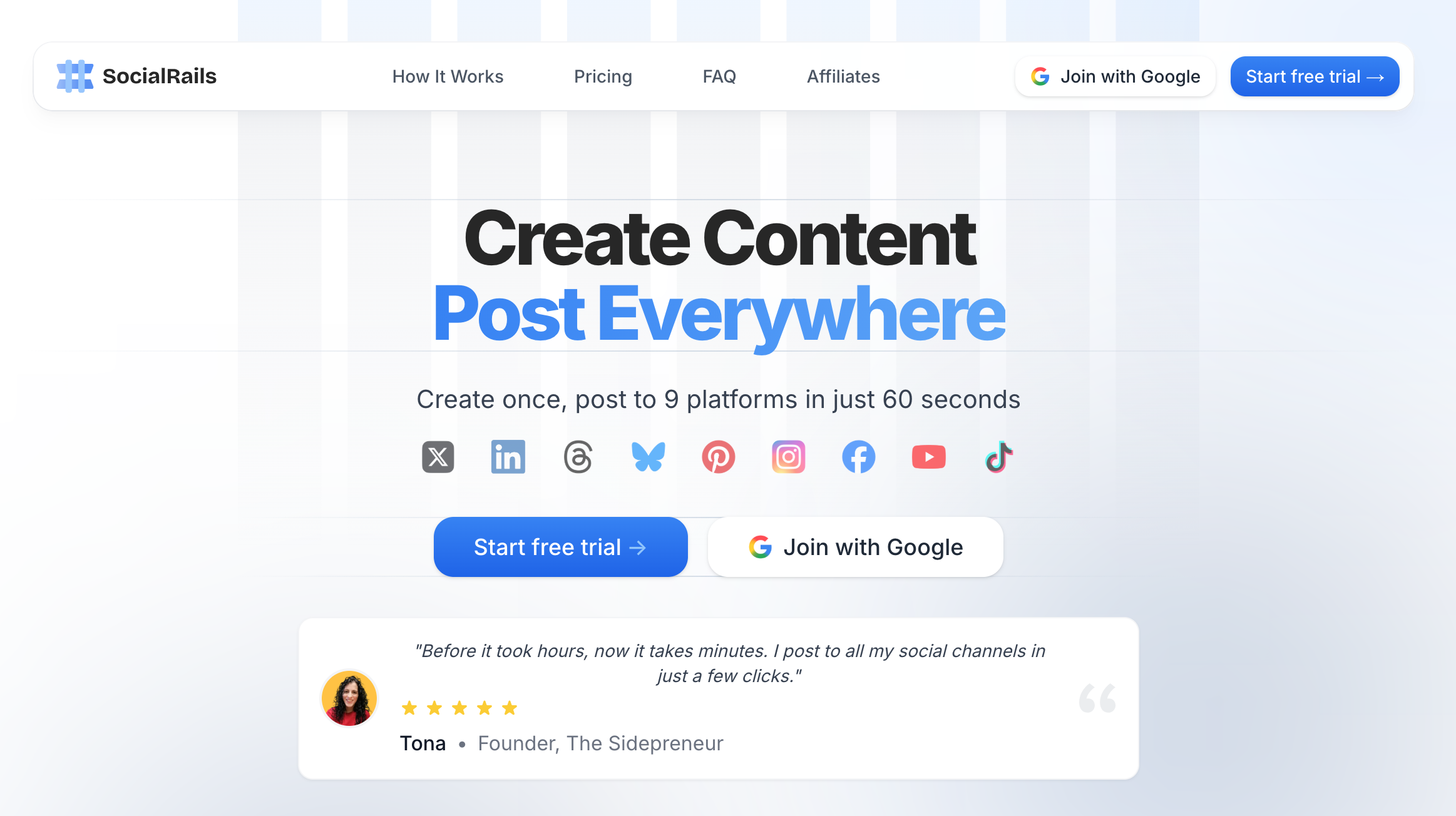 Facebook, Instagram, Threads, X (Twitter), LinkedIn, Pinterest, Google Business Profile, TikTok, YouTube, Mastodon, and Bluesky