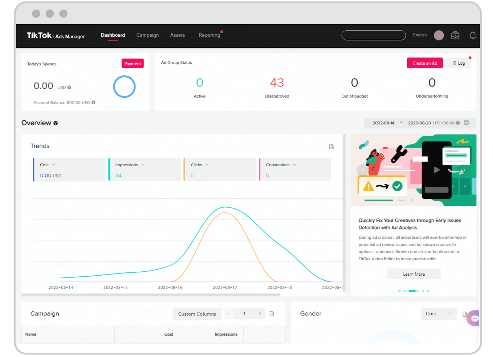 If you’re using TikTok for paid advertising campaigns (e.g., Spark Ads, Branded Mission Ads, etc.), Ads Manager provides more advanced tracking and reporting. It breaks down impressions, click-through rates, conversions, and cost-per-acquisition.