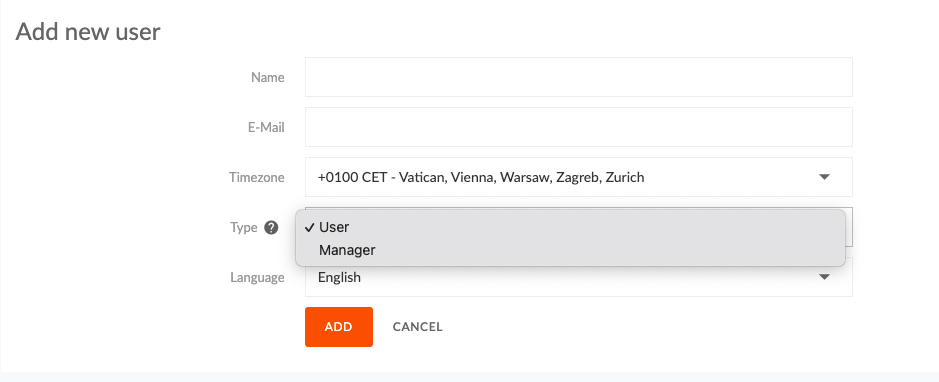 - Click on “Add new user” button, then type details (i.e. name and surname, email address) and select the account type (User or Manager) and confirm with the “Add” button.