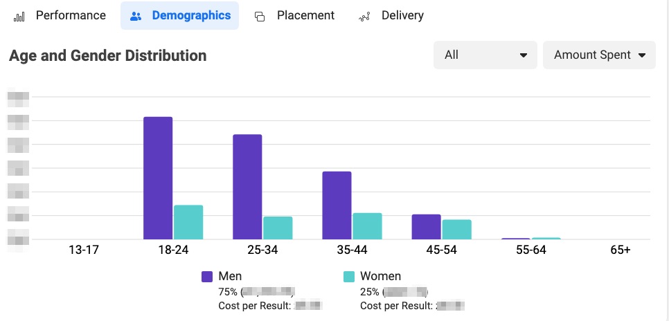 Here’s the amount spent. The name is pretty self-explanatory, but in case you’re not sure what it means, it’s just the amount you spent on these ads. From this tab, you can see how much of your budget was used on each age group, and then men and women within those age groups. Amount spent should give you a clear picture of how much of your budget ended up being used for each group.