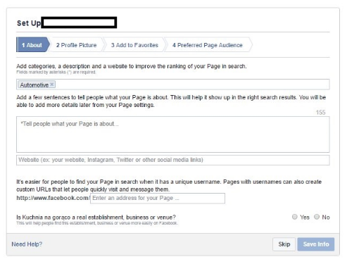 Next step is choosing profile picture for you Page – your logo, a picture of you local, or your mascot. The photo should be 180×180 px.