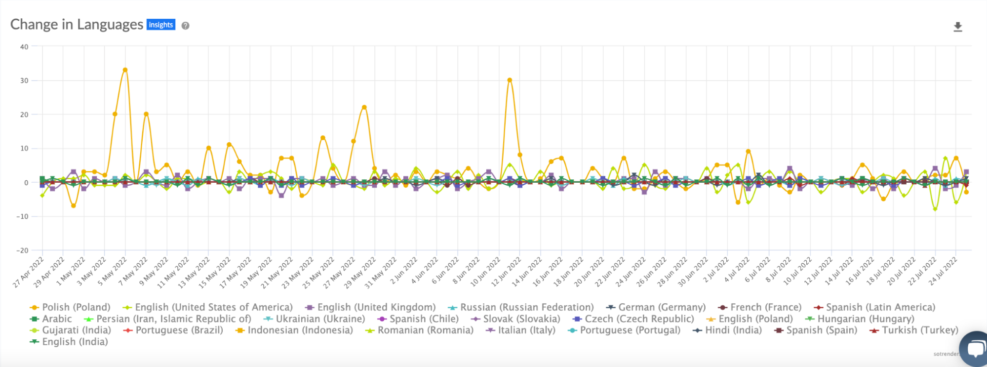 In Sotrender, you can check some more in-depth insights about your follower count, like the daily change of followers divided by language. This might be useful especially when you focus on some particular markets and want to grow your follower base in these regions.