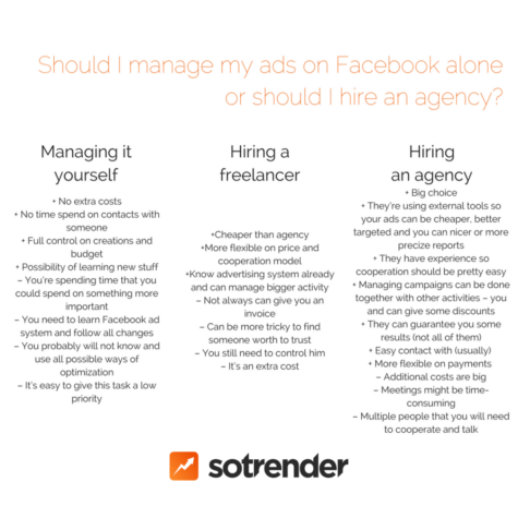 You know that Facebook ad campaigns are worth the hype, but you don’t know who should be in charge of them: you, a freelancer, or another agency. In this article, we’ll explain whether it’s worth it to manage your Facebook ads alone or hire someone to do that for you.
