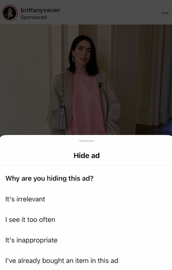 Once you click “Hide ad” you can tell Instagram why you no longer want to see this ad: