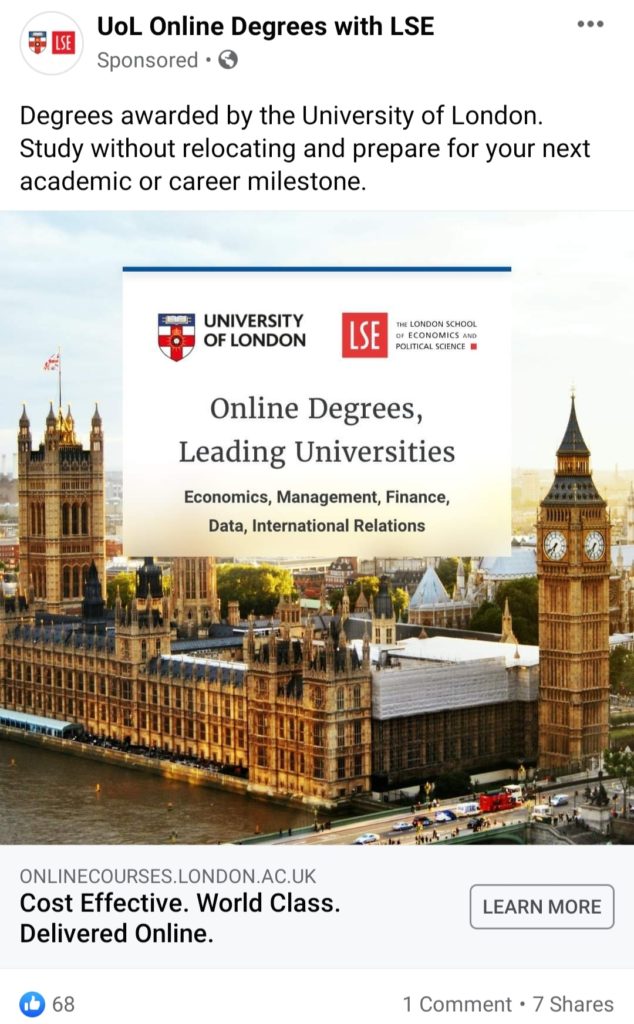 Notice how this ad’s CTA tells you that you can “learn more” on an external page with the link right next to it. It’s definitely going to get some traffic to their site. If that’s what you’re going for, you could choose this ad format.
