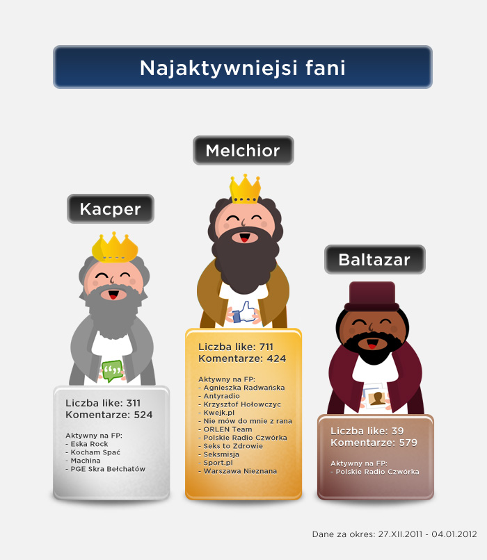 Niekwestionowanym królem, który składa niewątpliwie najhojniejszy dar ze swojego czasu Facebookowi, jest Melchior, który “polubił” najróżniejsze facebookowe treści aż 711 razy i tylko w okresie 27 grudnia 2011 – 4 stycznia 2012, czyli czasu ewangelicznej pielgrzymki do żłóbka trzech mędrców, zostawił aż 424 komentarze. Jego towarzysz podróży – Kacper – w tym samym okresie „lajkował” ponad dwukrotnie rzadziej, choć zostawił dokładnie 100 komentarzy więcej. Dość interesującą postacią jest Baltazar, który zogniskował praktycznie całą swoją aktywność na fanpejdżu Polskiego Radia Czwórka, gdzie komentował aż 579 razy. Lubił przy tym znacznie rzadziej niż pozostali królowie Facebooka, bo “tylko” 39 razy.