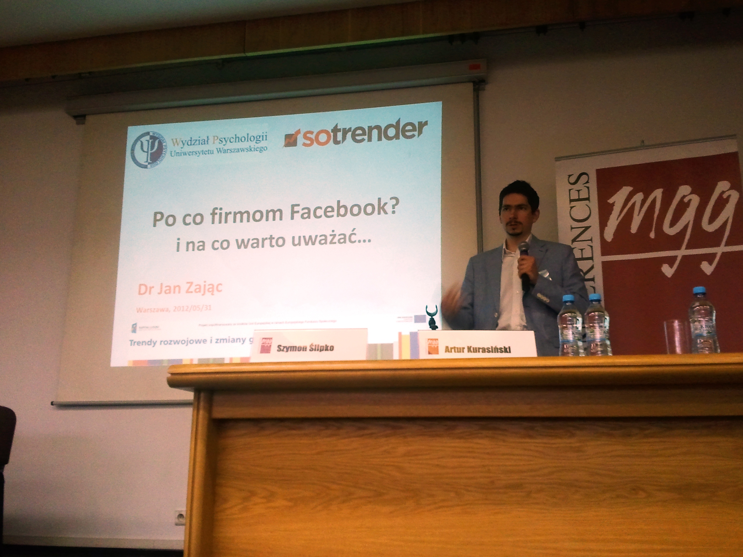 Mówiłem, jak zwykle ostatnio, o Facebooku i szerzej marketingu w social media. Po wystąpieniu miałem długą dyskusję z uczestnikami dotyczącą wiecznie aktualnego pytania: po co firmom Facebook. Wciąż duże zainteresowanie wywołuje przede wszystkim działanie Edge Ranka, omawianie w zasadzie bezustanne (świetny przykład fanpage’a „Jesus Daily” – dzięki dla Yuriego Drabenta za inspiracje!) – oraz to, że na Facebooku „liczba fanów” a „zasięg i zaangażowanie” to dwie różne sprawy.Niestety, mechanizmy działania Facebooka nawet dla wielu marketerów są nieprzeniknione, wciąż potrzebna jest edukacja… Brakuje też najlepszych praktyk i “success stories” z nietypowych branży, bo dla wielu firm ugryzienie obecności w mediach społecznościowych jest wciąż kwestią nietrywialną. Stąd moje rozmowy z obecnymi na sali przedstawicielami firmy energetycznej oraz przewoźnika kolejowego.