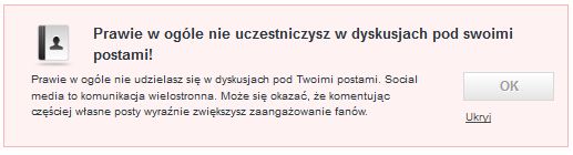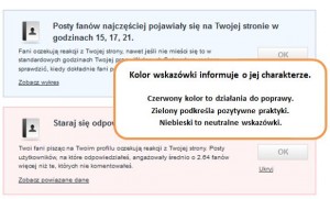 Wskazówki znacznie nam ułatwią osiągnięcie tego celu. Lista porad w zakładce Interakcje obejmuje uwagi co do częstotliwości komentowania postów na fanpage’u oraz informacje co do dni i godzin aktywności fanów. Zwrócenie szczególnej uwagi na okresy największej aktywności internautów ułatwi odpowiadanie na czas na posty lub wybór terminów przeprowadzania ważniejszych działań.