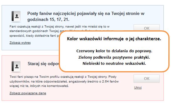 Wskazówki podsumowują w przejrzysty sposób prowadzone działania w liście uwag, które są pomocne przy prowadzeniu profili. Każda Wskazówka jest sformułowana jako klarowne podsumowanie działalności prowadzącego i fanów na Facebooku z wyjaśnieniem i rekomendacjami dalszych działań.