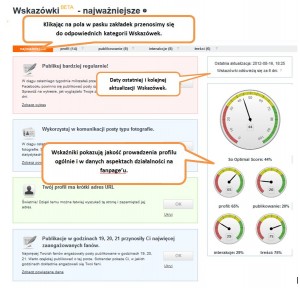 Po prawej stronie znajdują się wskaźniki jakości prowadzenia strony w różnych kategoriach, odpowiadających podziałowi Wskazówek w zakładkach. Odpowiednie wskaźniki będą towarzyszyć nam przy przechodzeniu do kolejnych kategorii w kolejnych zakładkach.
