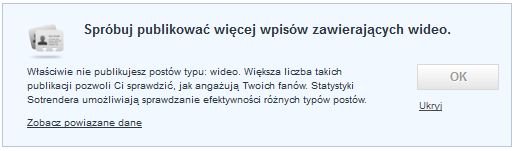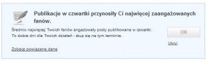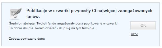 Warto zdiagnozować jakie posty wywołują najżywsze reakcje fanów. We Wskazówkach dowiemy się, jak postować aby osiągnąć jak najlepsze rezultaty. Na podstawie analizy dotychczasowych postów otrzymamy informację, które dni i godziny wywołują najżywsze reakcje fanów. Z drugiej strony jeżeli zaniedbujemy jakieś pory postowania, odpowiednia wskazówka zasugeruje, żeby i w nich sprawdzić skuteczność naszych działań.