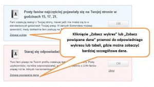 Wskazówki są kompletnym narzędziem dającym listę rekomendacji optymalizacyjnych i nie wymagają odwoływania się do innych źródeł w celu zinterpretowania ich, choć do głębszej analizy takie odwołania mogą być bardzo pomocne. Dlatego wiele Wskazówek odsyła nas do odpowiednich wykresów lub rankingów, które mogą nas doprowadzić do bardziej szczegółowych wniosków. Wystarczy, że klikniemy link pod Wskazówką „Zobacz powiązane dane” lub „Zobacz wykres”, który skieruje nas bezpośrednio do odpowiedniej funkcji narzędzia. Z kolei wykresy prowadzą nas często do bardziej szczegółowych informacji, jak na przykład zestawienia postów z wybranych dni.