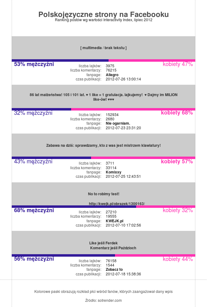 Warto też zwrócić uwagę na banalnie proste sposoby skłaniania do klikania w „Lubię to” i komentowania, zwane też żebrolajkami. Jest to coraz popularniejsza technika, wykorzystywana nie tylko przez rozrywkowe fanpage’e – widać to w zestawieniu najpopularniejszych postów. Coraz częściej próbują budować na tym komunikację poważne profile, którym takie działania nie przystoją, a tym bardziej nie przynoszą prawdziwych korzyści dla marki. Więcej o rekordowych postach i żebrolajkach pisaliśmy niedawno na blogu Sotrendera . W tę poetykę świetnie wpisał się niewielki fanpage Zobacz to, który zaangażował 39 razy więcej użytkowników niż ma fanów i zajął 3 miejsce w ogólnopolskim rankingu liczby zaangażowanych fanów. Taki wynik i nagłe wielkie zainteresowanie strona zawdzięcza przede wszystkim postowi odwołującemu się do znanych i lubianych bohaterów popkultury. Próbowało także Allegro, które podjęło próbę pobicia rekordu Guinessa w komentarzach do posta. Zabrakło sporo – z potrzebnych 377 tysięcy komentarzy udało się zebrać niecałe 74 tys. W tej sytuacji, podobnie jak wielu polskim olimpijczykom, możemy pogratulować odwagi, ale nie wyniku 😉