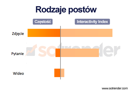 Dokładnie taką samą analizę możemy zrobić dla różnych rodzajów postów (zdjęcia, linki, wideo, teksty etc).  Standardowo największą część zaangażowania zgarniają zdjęcia, choć  mimo mniejszej częstotliwości publikowania pytań, to one względnie najbardziej angażują.