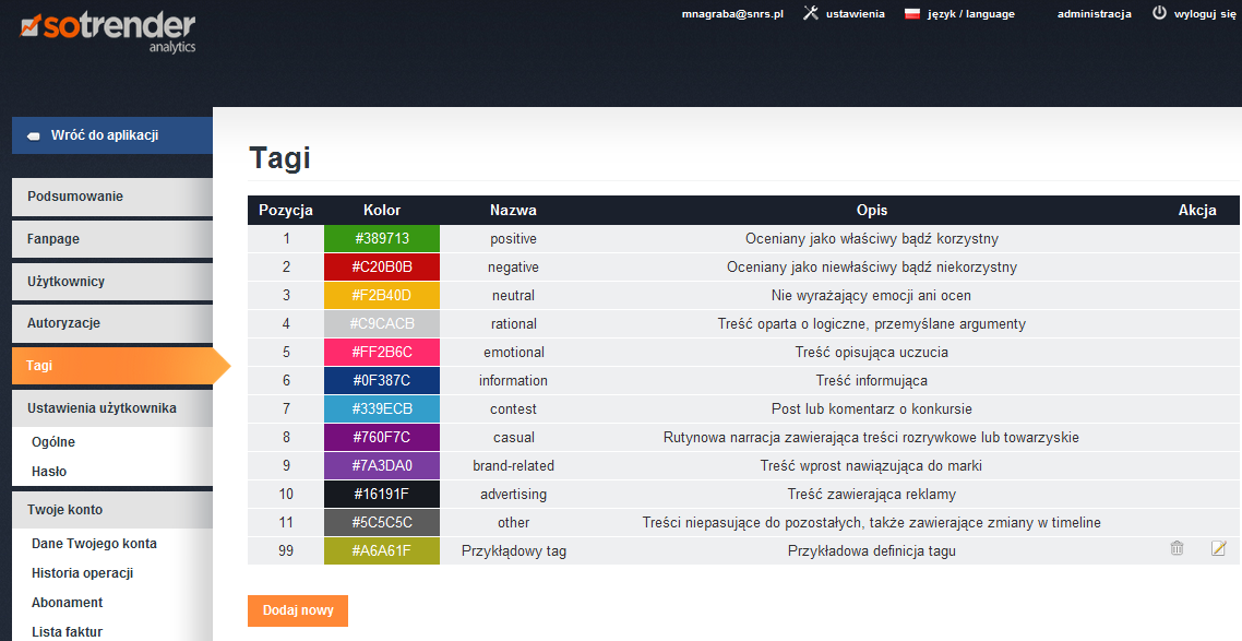 Zanim zaczniecie tagować warto wiedzieć, że istnieje możliwość wprowadzenia do Sotrendera własnych tagów – możecie je dodać w zarządzaniu kontem (“Ustawienia”  prawy górny róg).
