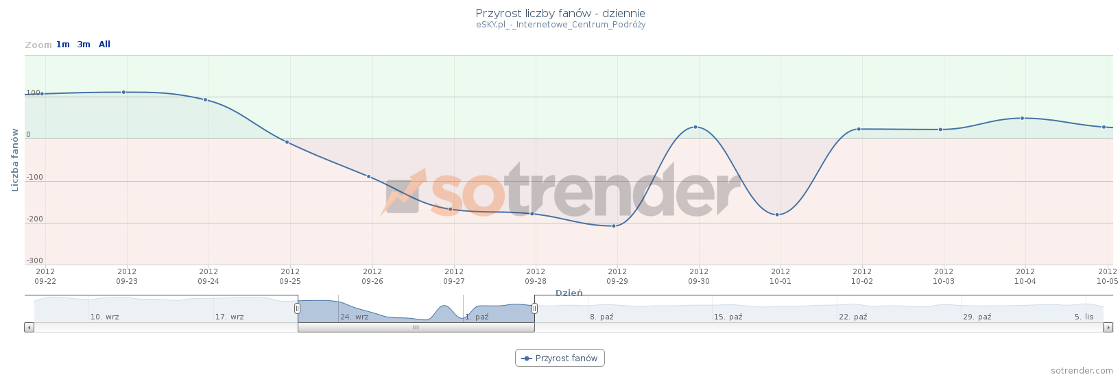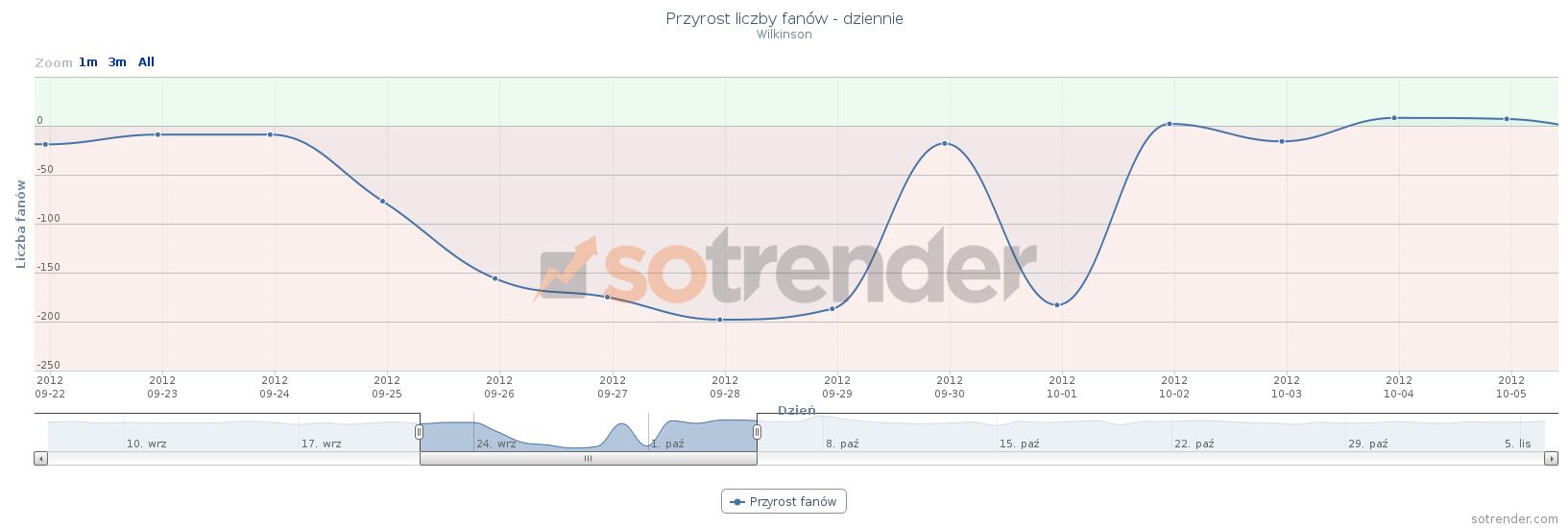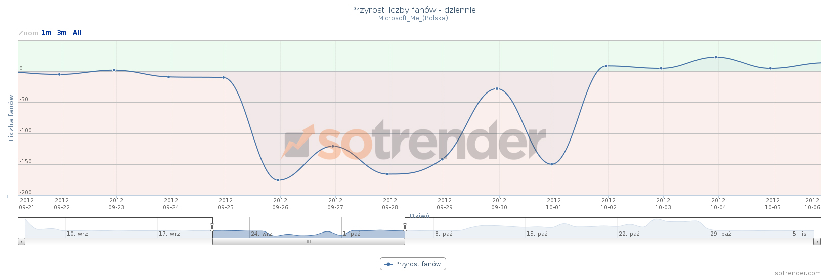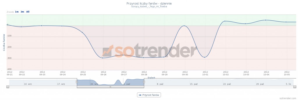 Wymienione fanpage są również w czołówce tych, które poniosły największe straty procentowe. Jeśli skorzystamy z Sotrendera to możemy w łatwy sposób przeglądać wykresy pokazujące jak kreował się przyrost fanów tych fanpage’y w wybranym przez nas okresie. Poniżej przedstawione są wykresy z Sotrendera dla 5 fanpage’y, które procentowo najbardziej ucierpiały na akcji Facebooka: