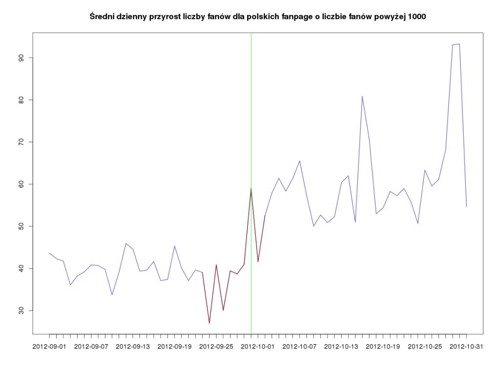Najpierw spojrzeliśmy w statystyki zbiorcze, sprawdzając średni dzienny przyrost liczby fanów dla polskich fanpage’ów o liczbie fanów powyżej 1000 w okresie 1.09 – 30.10.2012. Nawet przy tak dużej skali można zauważyć, kiedy nastąpiło usuwanie. Czerwony kolor linii wykresu odpowiada dniom, w których Facebook usuwał fikcyjne konta. Był to dokładnie tydzień, od wtorku do poniedziałku. Co ciekawe, w niedzielę 30. września serwis zrobił odpoczynek od „sprzątania”, co przedstawia lokalny wzrost, oznaczony zieloną linią. Czyżby oznaczało to, że usuwaniem fanów nie zajmował się jedynie bezduszny automat, lecz także ludzie, którzy mieli dzień wolnego?
