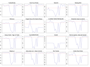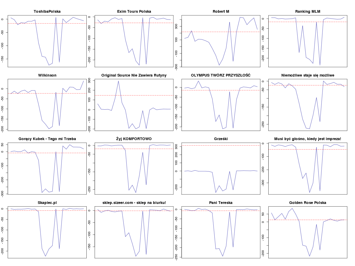 Jednak, gdy przyjrzymy się tym fanpage’om, które we wspomnianych dniach traciły najwiecej fanów to opisywana akcja stanie się dużo bardziej czytelna. Poniżej przedstawiamy wykresy dziennych przyrostów liczby fanów dla 16 fanpage’ów, które straciły w tych dniach najwięcej fanów. Widoczny na wszystkich wykresach jest charakterystyczny wzór – duże spadki w stosunku do przeciętnych dziennych zmian (czerwona przerywana linia), przy czym w niedzielę 30.09 zmiana liczby fanów na poziomie standardowym.