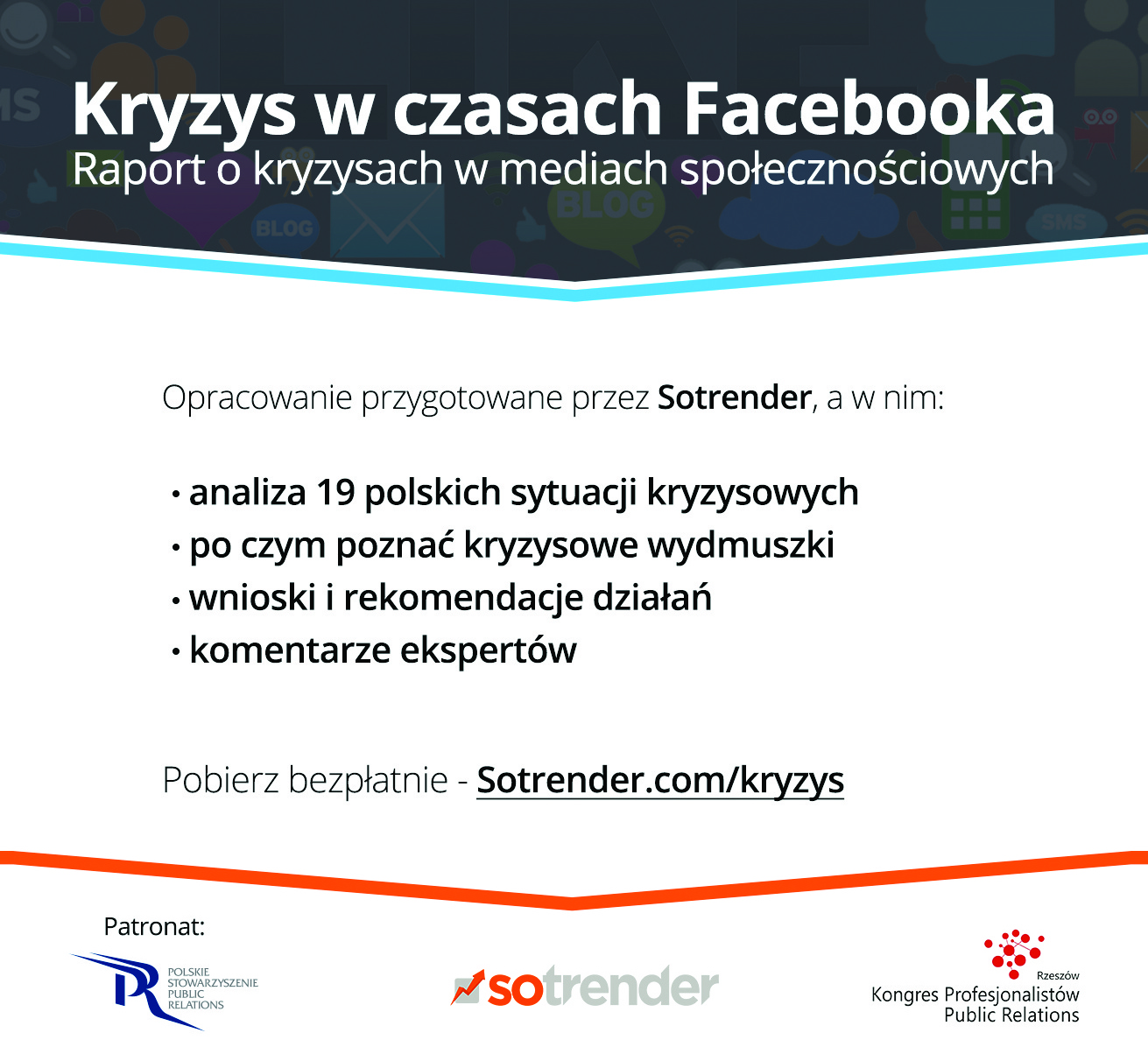 Raport „Kryzys w czasach Facebooka“ to pierwsze opracowanie w zwięzły sposób przedstawiające najważniejsze wnioski z kryzysów i sytuacji problematycznych w social media, które wydarzyły się w Polsce od początku 2012 r.. Zależało nam, aby osoby odpowiadające za zarządzanie reputacją marki dostały rekomendacje, które będą przekładalne na praktyczne działania.