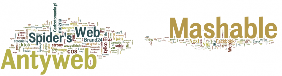 Choć tagi oparte o posty administratorów polskich blogów technologicznych są zbliżone do treści postowanych przez pozostałe fanpage związane z IT, ciekawa jest chmura tagów postów użytkowników na fanpage’ach blogowych. Obrazek ten jest analogiczny do chmury opracowanej przez nas dla użytkowników zagranicznych blogów technologicznych – Mashable, TechCrunch, The Next Web, ReadWrite i inne. Antyweb, w tym przypadku, jest bardzo zbliżony do Mashable, który umożliwiając użytkownikom pisanie na ich tablicy stanowi najpopularniejsze słowo w postach użytkowników.