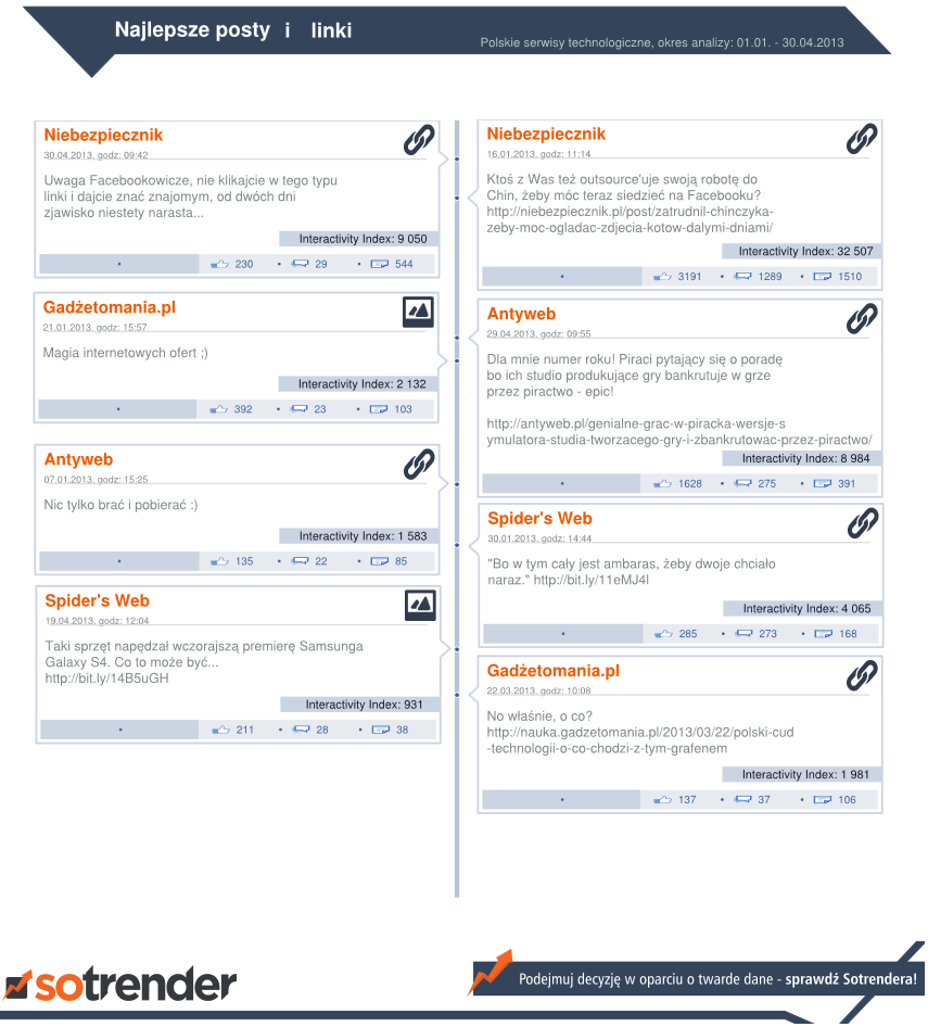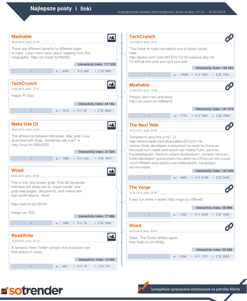 Analizie poddaliśmy również najlepsze treści zamieszczane na Facebooku przez polskie i anglojęzyczne serwisy technologiczne. W tym celu porównaliśmy wybrane blogi – Antyweb, Spider’s Web, Niebezpiecznik, Gadżetomiania.pl, Mashable, TechCrunch, ReadWrite (wcześniej ReadWriteWeb), The Next Web, Brian Solis, Engadget, Wired, GigaOM, The Verge, SlashGear oraz Make Use Of – i interaktywność ich postów oraz linków.