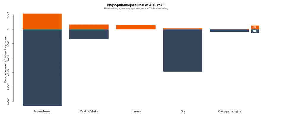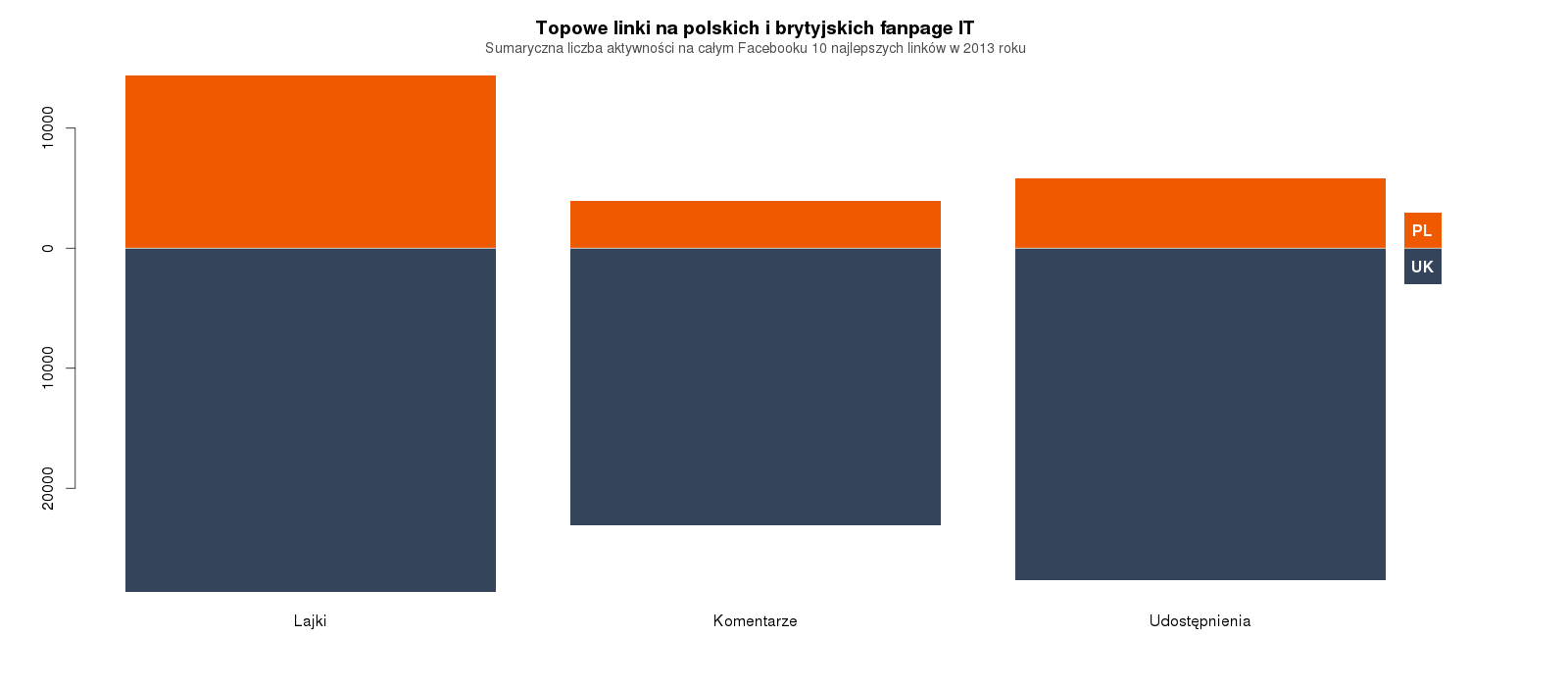 Liczby poszczególnych aktywności zbierane przez najpopularniejsze linki na polskim oraz brytyjskim Facebooku