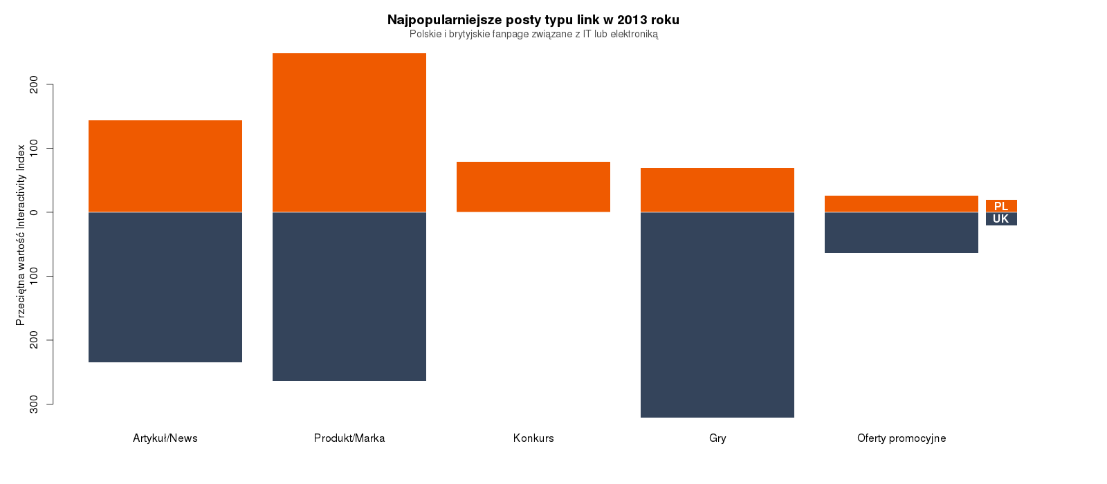Zarówno w Polsce jak i w Wielkiej Brytanii największym zainteresowaniem cieszą się artykuły oraz newsy – ich Interactivity Index w obu krajach jest największy. W przypadku UK na drugim miejscu są gry i dopiero na trzecim produkt lub marka. W Polsce posty dotyczące produktu znajdują się już na drugim miejscu, a blisko za nimi konkursy, które są dużo popularniejsze niż gry czy oferty promocyjne. Powyższy wykres ujmuje całkowitą liczbę aktywności związaną z danym linkiem, a nie z pojedynczym postem. Poniżej przedstawiamy analogiczny wykres uwzględniający jedynie aktywności pod konkretnymi postami: