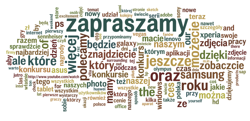 Zacznijmy od szybkiego spojrzenia na treści publikowane przez administratorów stron związanych z IT, takich jak Samsung, Nokia czy Intel – chmura tagów pozwoli na intuicyjny obraz tego, o czym i w jaki sposób się mówi: