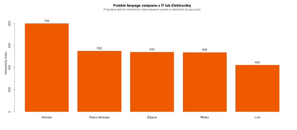 Zapewne każdy content manager wie, że aby angażować ludzi należy postować zdjęcia. Powyższy wykres tego nie podkreśla – należy to uznać za charakterystykę branży. Najbardziej interaktywne są ankiety, które zawsze wybijają się ponad wszystkie typy postów. Zjawisko to często nie jest przez administratorów stron odpowiednio wykorzystywane – w konsekwencji tego typu postów pojawiło się tylko 13. Co ciekawe, statusy tekstowe oraz wideo są bardzo popularne w przypadku stron technologicznych. Linki wydają się być najmniej użyteczne, jednak pokażemy, że to nie jest do końca prawda.