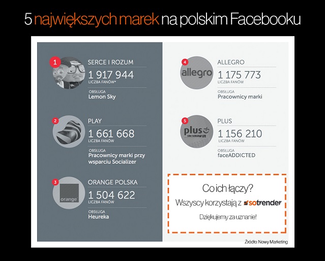 Sotrender jest wykorzystywany przy prowadzeniu 5 największych profili marek na polskim Facebooku i aż 28 spośród 50 największych. Taki wniosek płynie dla nas z lektury raportu „Kto powinien obsługiwać marki w serwisach społecznościowych”, wydanego przez Nowy Marketing i zamieszczonego tam zestawienia obsługujących fanpage. Co więcej, o korzystaniu z naszej aplikacji wspominają w raporcie specjaliści pracujący dla takich marek jak BZ WBK, In Post, Peugeot czy Plus. Cieszymy się, że nawet najbardziej wymagający odbiorcy doceniają nasze usługi.